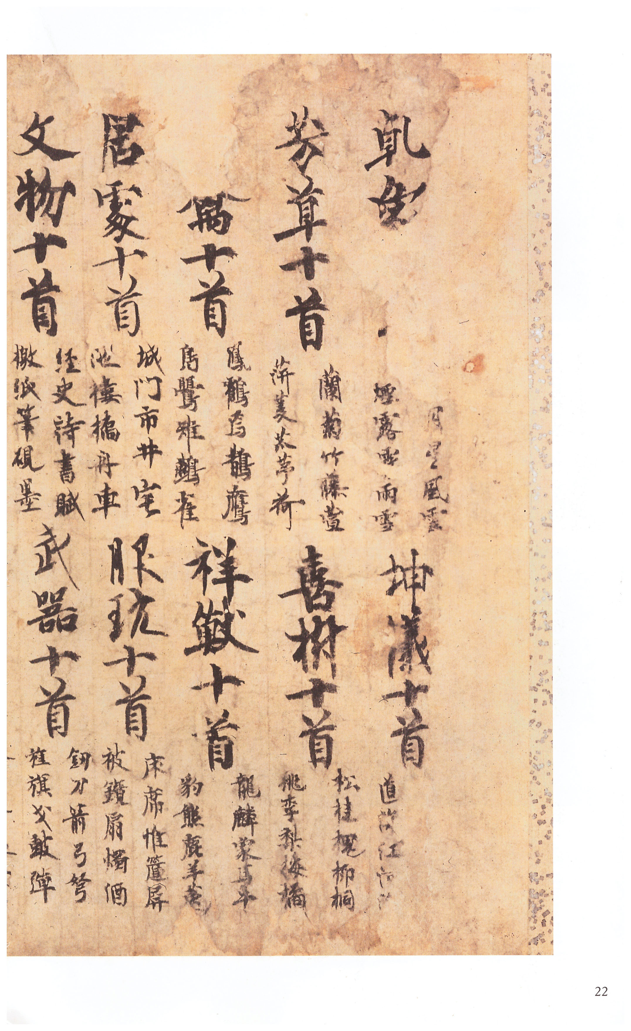 嵯峨天皇-日本 乹坤儀十首,芳草十首,喜樹十首,禽十首,祥獸十首,居䖏十首,服玩十首,文物十首,武噐十首。 音樂十首玉帛十首,扶桒路遙升若木,雲五色滿霞際,九光披東陸,駕南郊赤羽馳傾心比朝夕,奉堯曦 桂生三五夕,蓂開二八时。分暉度鵲鏡,流影入娥眉。晈㓗臨踈牖,玲瓏鑒薄帷。願陪北堂宴,清夜幸同嬉。蜀郡靈搓轉,豐城寳氣新。将軍臨北塞,天子出西秦。未 作三台輔,宁為五老臣。今霄頴川曲,誰識聚賢人。落日正沉沉,微凨生北林。帶花疑鳳舞,向竹似龍吟。月影臨秋扇,松聲入夜琴。若至蘭臺 下,還拂楚王襟。大梁白雲起,亭亭(??)殊未歇。錦人觸石来,益影淩天彂。氛氲万年樹,掩暎三秋月。會入大風歌,従龍赴貟闕(?)。瑞氣淩丹闕(?),空濛上翠微。逈 浮雙闕(?)路,遙拂九仙衣。桑柘凝寒色,松篁暗晚暉。還尝紫霄上,時接白雲飛。滴瀝明花苑,葳蕤泫竹叢。玉垂丹?(棘)下,珠湛绿荷中。夜 警千年鸖,朝晞八月風。願凝仙掌内,長奉未央宮。曺公之夢澤,漢帝出平城。別有丹山霧,玲瓏素月明。類烟霏稍重,方雨散還輕。儻入非熊繇,寧思玄豹情。 西北雲膚起,東南雨足来。靈童出海見,神女向山廻。斜影凨前合,圎文水上開。十旬無破塊,九圡信康哉。雨雪驚千里,従風暗九霄。(地)疑 明月夜,山似白雲朝。逐舞花光散,臨紈扇影飄。大周天?(阙)路,今日海神朝。仙嶺欝氳,峨峨上翠氛。泉飛一道帶,峯上半天雲。古壁丹青色,新花錦繡文。已?(開)封 禪?,希謁聖明君。宗子維城固,将軍飲羽威。巖花鏡裏彂,雲葉錦中飛。入宋星初霄,過湘䴏早归。儻因持補極,宁須想支機。 王粲銷憂日,江淹起恨年。帶川遥绮錯,分隰逈阡眠。 膴膴橫周甸,莓苔闕晉田。方知急難響,長在鶺鴒篇。鳳去秦郊逈,鶉飛楚塞空。蒼捂(梧)雲影去,涿鹿霧光 通。草暗平原绿,花明春徑紅。誰雲板築士,獨在傳巖中。貢禹懷書日,張衡作賦晨。杏花開鳳?,昌葉布龍鱗。瑞麦兩岐秀,嘉禾九穗新。 寧知帝王力,擊壤自安貧。銅駞分鞏洛,劔阁啓臨邛(卭)。紫檄三千里,青楼十二重。玉閞塵似雪,金穴馬如龍。今日中衢士,堯樽更可逢。習坎踈丹壑,朝宗合紫微。 三山巨鼇踊,万里大鵬飛。楼寫春雲色,珠含眀月輝。會尝添霧露,方逐衆川归。日夕三江望,靈湖万里廻。霞津錦浪動,月浦練光開。湍 似黄牛去,濤如白馬来。英靈已傑士,誰識卿雲才。河出崑崙中,長波接漢空。桃花生馬頰,竹箭入龍宮。德水千年變,榮光五色通。若披蘭葉捡,還沐上皇凨。 九洛韶光媚,三川物候新。花眀珠鳳浦,日映玉雞津。元禮期仙客,陳王覩麗人。玄龜方錫瑞,绿字佇来臻。 (资源为高清大图)