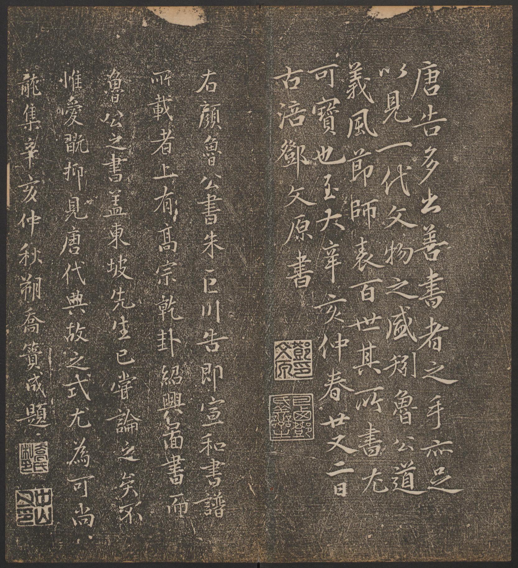 唐告多出善书者之手,亦足以见一代文物之盛,矧鲁公道义风节,师表百世,其所书尤可宝也!至大辛亥仲春廿又二日古涪邓文原书。右颜鲁公书朱巨川告,即宣和书谱所载者。上有高宗乾卦绍兴图书,而鲁公之书,盖东坡先生已尝论之矣。不惟爱玩抑见,唐代典故之式尤为可。尚龙集辛亥仲秋朔乔篑成题。