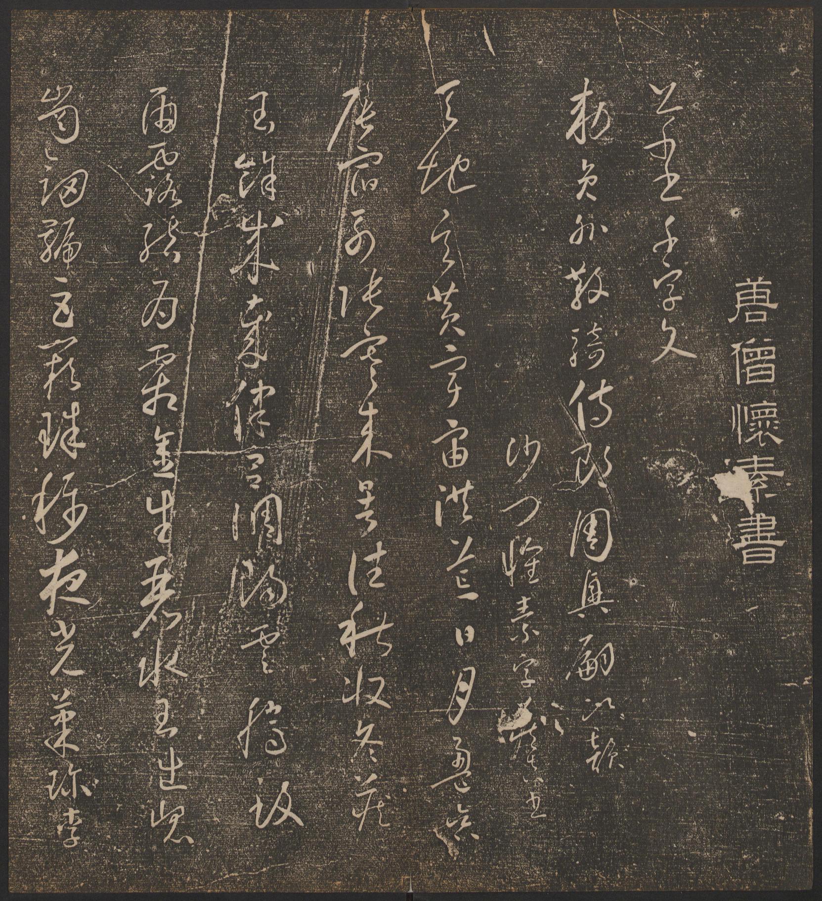 唐僧怀素书。草书千字文。敕员外散骑侍郎周兴嗣次韵。沙门怀素字藏真书。天地玄黄,宇宙洪荒。日月盈昃,辰宿列张。寒来暑往,秋收冬藏。玉(闰)余成岁,律吕调阳。云腾致雨,露结为霜。金生丽水,玉出崐岗。剑号巨阙,珠称夜光。果珍李