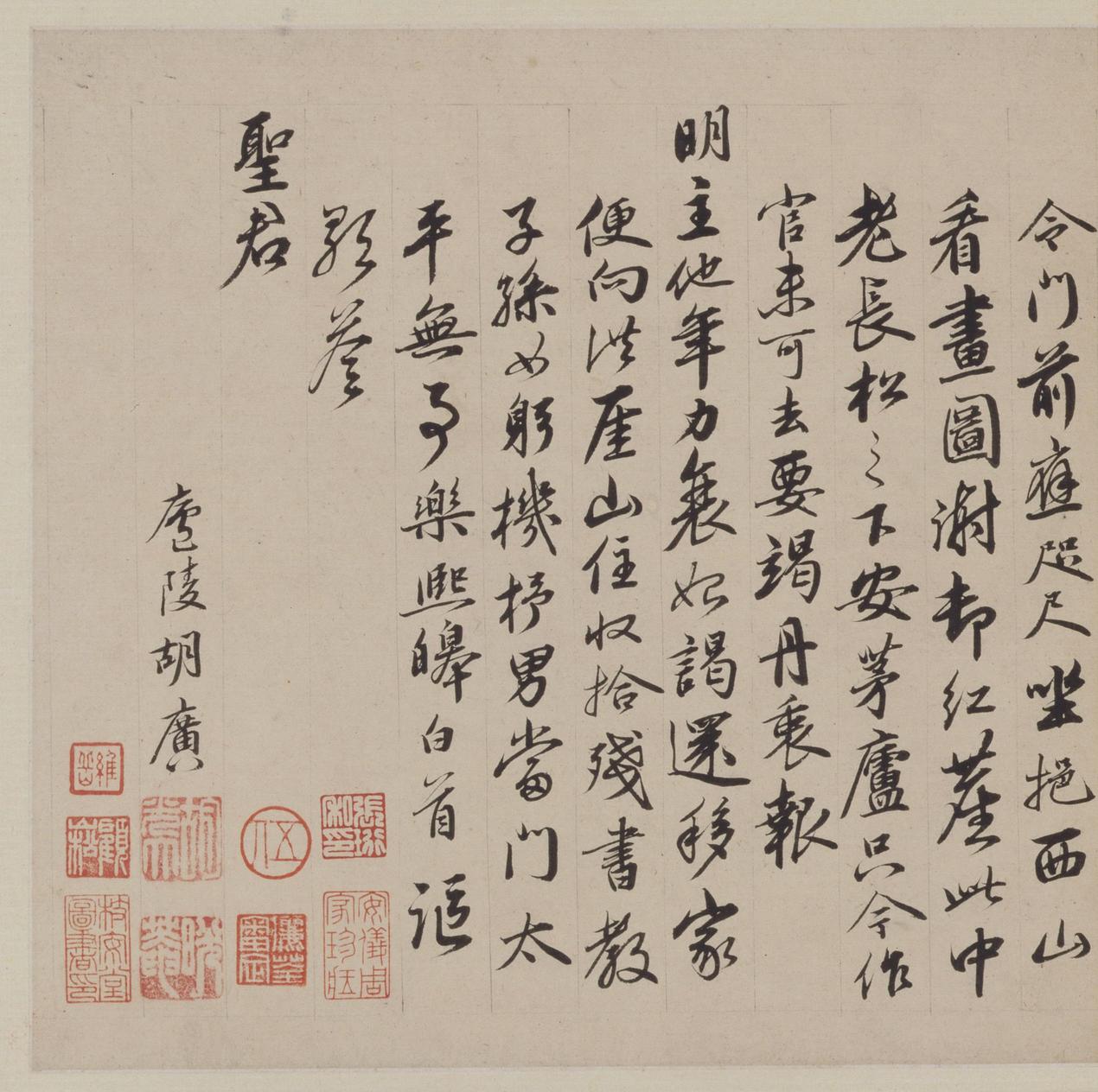 令门前应咫尺,坐挹西山看画图。谢却红尘此中老,长松之下安茅庐。只今作官未可去,要竭丹衷报明主。他年力衰始谒还,移家便向红厓山住。收拾残书教子孙,女躬机柕男当门。太平无事乐熙皞,白首讴歌答圣君。庐陵胡广