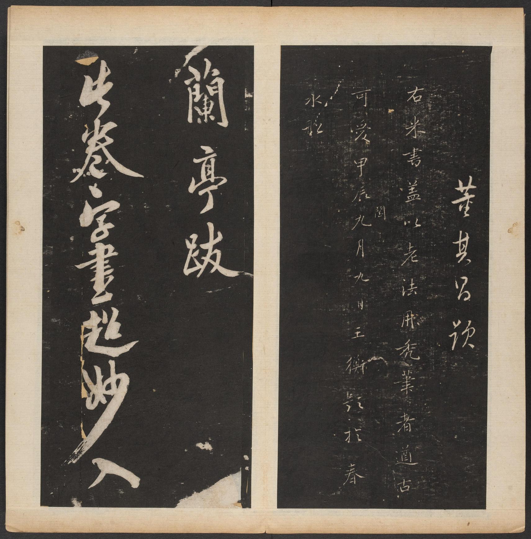 董其昌题。右米书盖以老法用秃笔者。遒古可爱。甲辰闰九月九日王衡题于春水船。兰亭跋,此卷字画超妙入