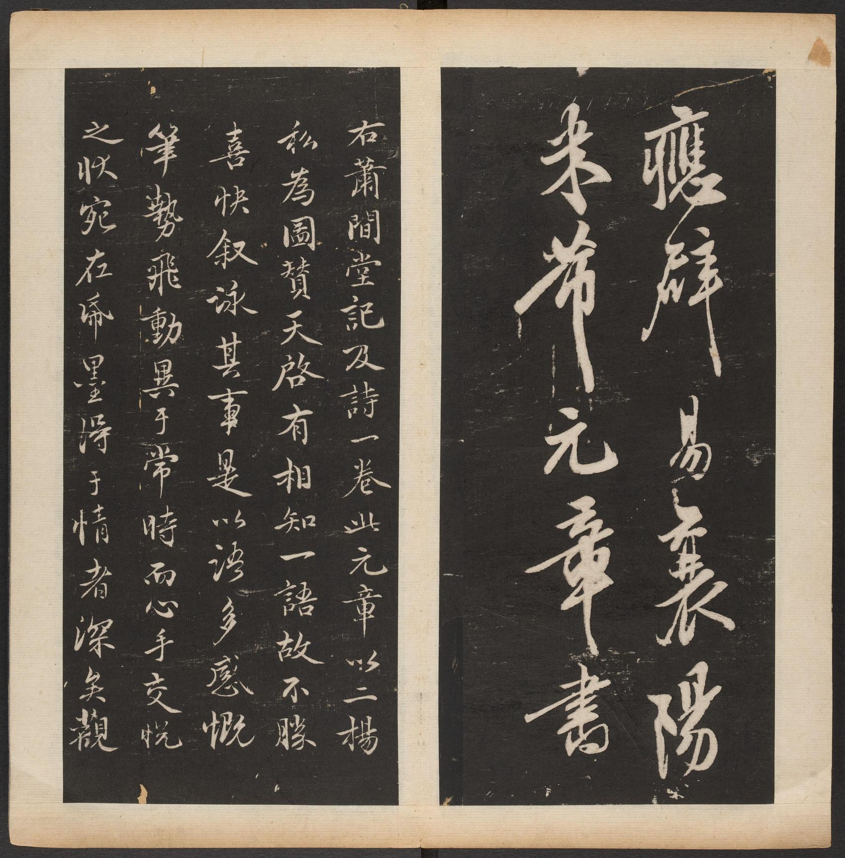 应辟易。襄阳米芾元章书。右萧间堂记及诗一卷,此元章以二杨私为图赞。天启有相知一语,故不胜喜快。叙咏其事,是以语多感慨,笔势飞动,异于常时,而心手交悦之状,宛在纸墨,得于情者深矣。观