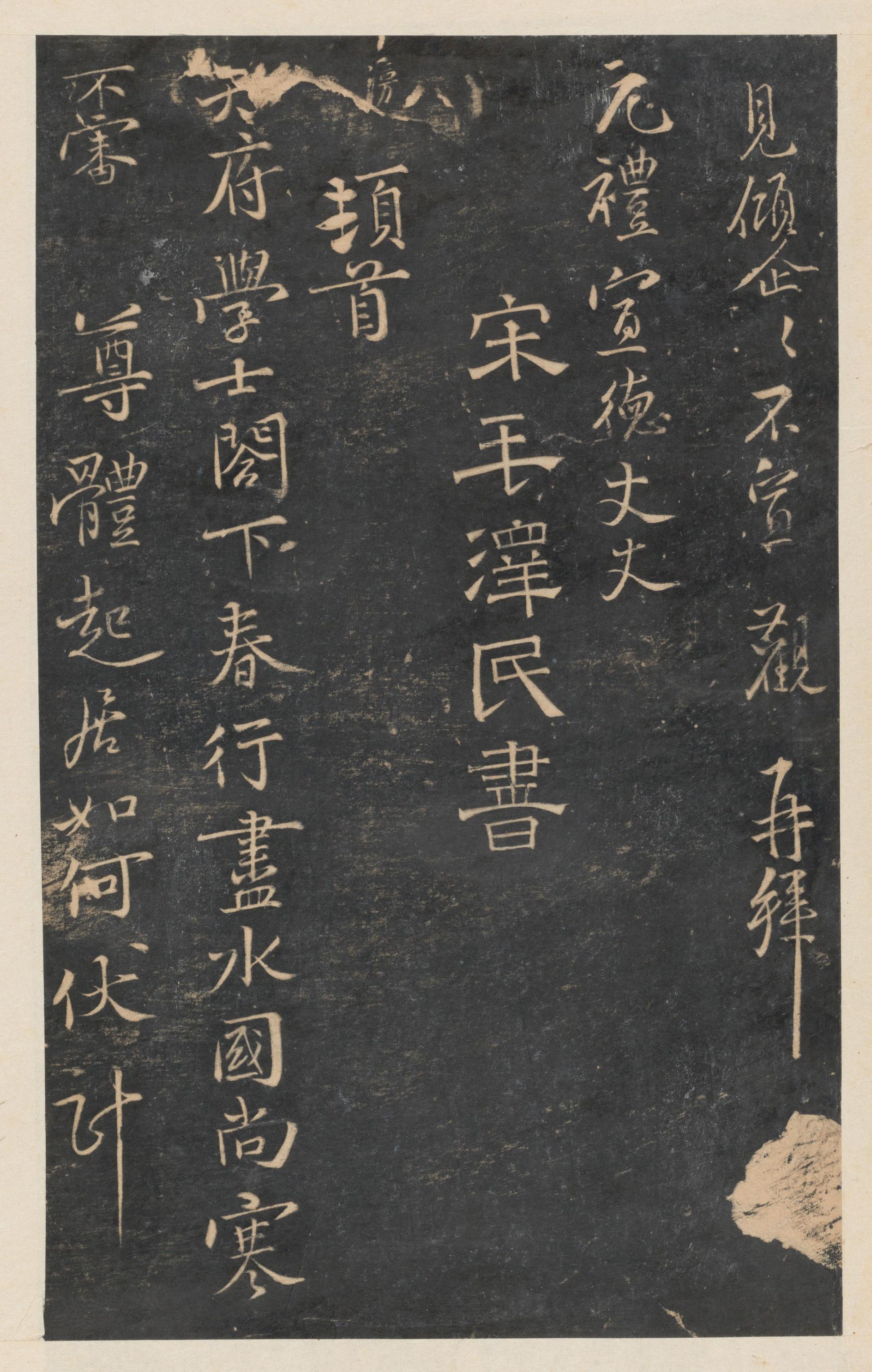 见倾企企不宣,观再拜,元礼宣德丈丈(字形如是,存疑)。宋毛泽民书,滂顿首。知府学士阁下,春行尽水国尚寒不审,尊体起居如何?伏计