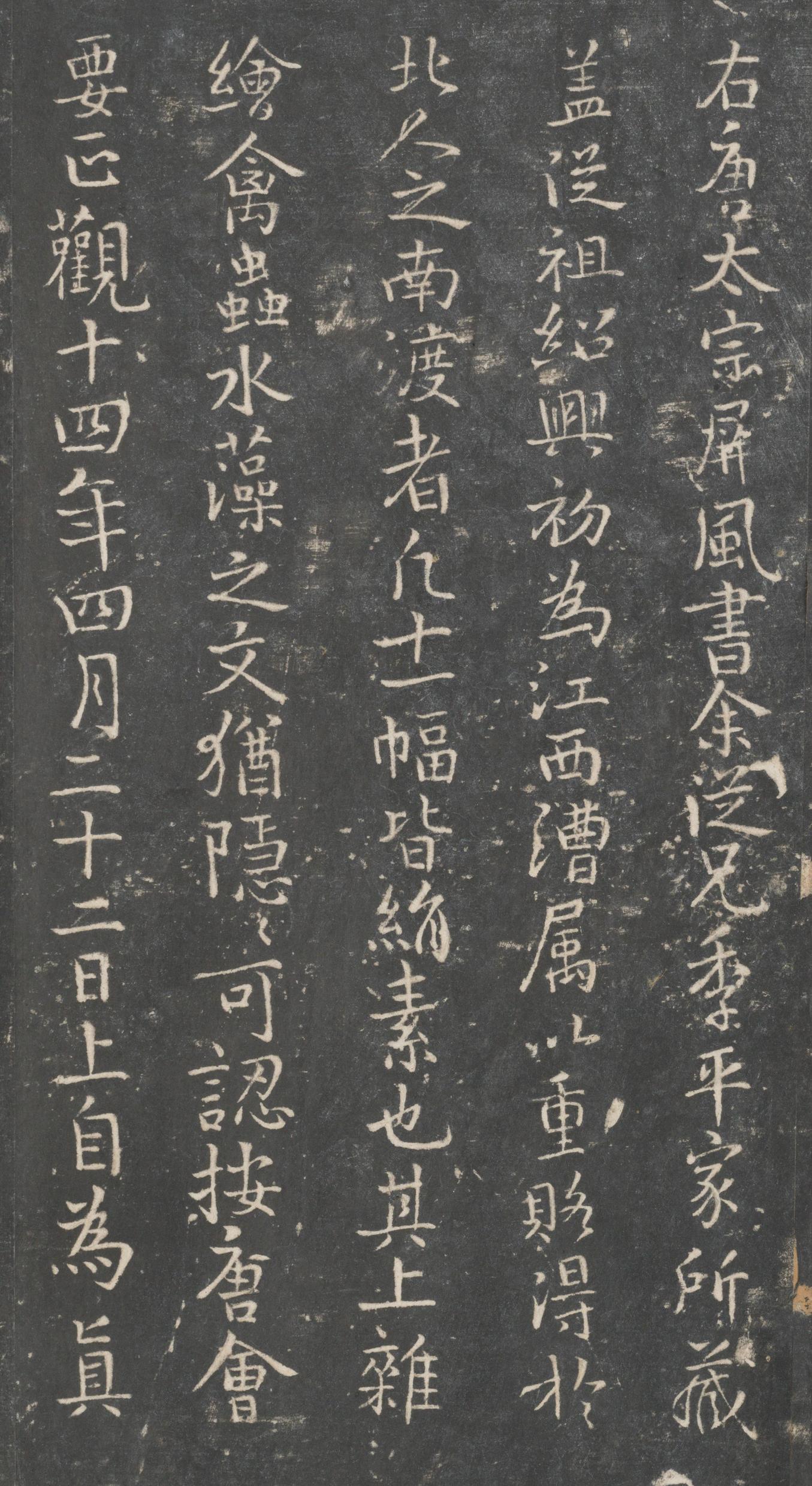 右唐太宗屏风书,余从兄季平家所藏,盖从祖绍兴初为江西漕属,以重赂得于北人之南渡者,凡十一幅,皆绢素也。其上杂绘禽虫水藻之文,犹隐可认。按《唐会要》正(贞)观十四年四月二十二日,上自为真