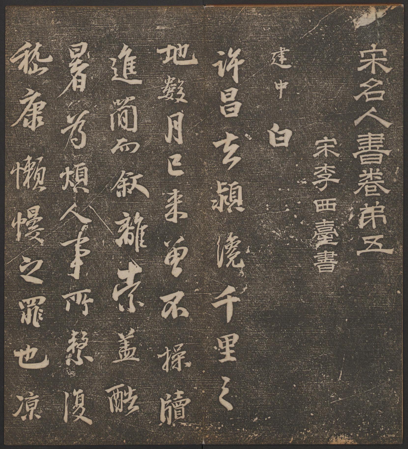 宋名人书卷弟(第)五,宋李西台书,建中白,许昌去颍,才千里之地,数月已来,曾不操牍进简,而叙离索,盖酷暑为烦,人事所系,复嵇康懒慢之罪也。凉