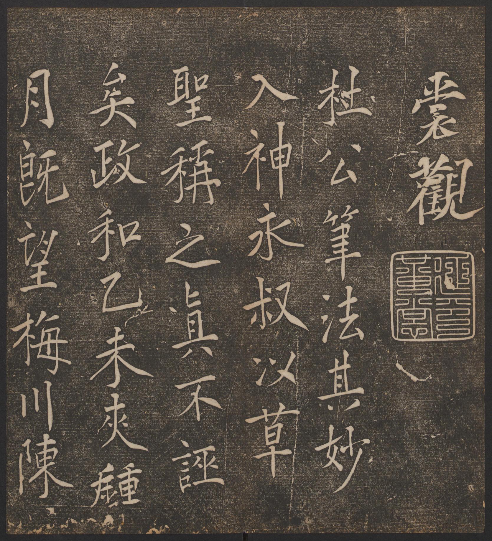 裳观。杜公笔法,其妙入神,永叔以草圣称之,真不诬矣,政和乙未夹钟月既望,梅川陈