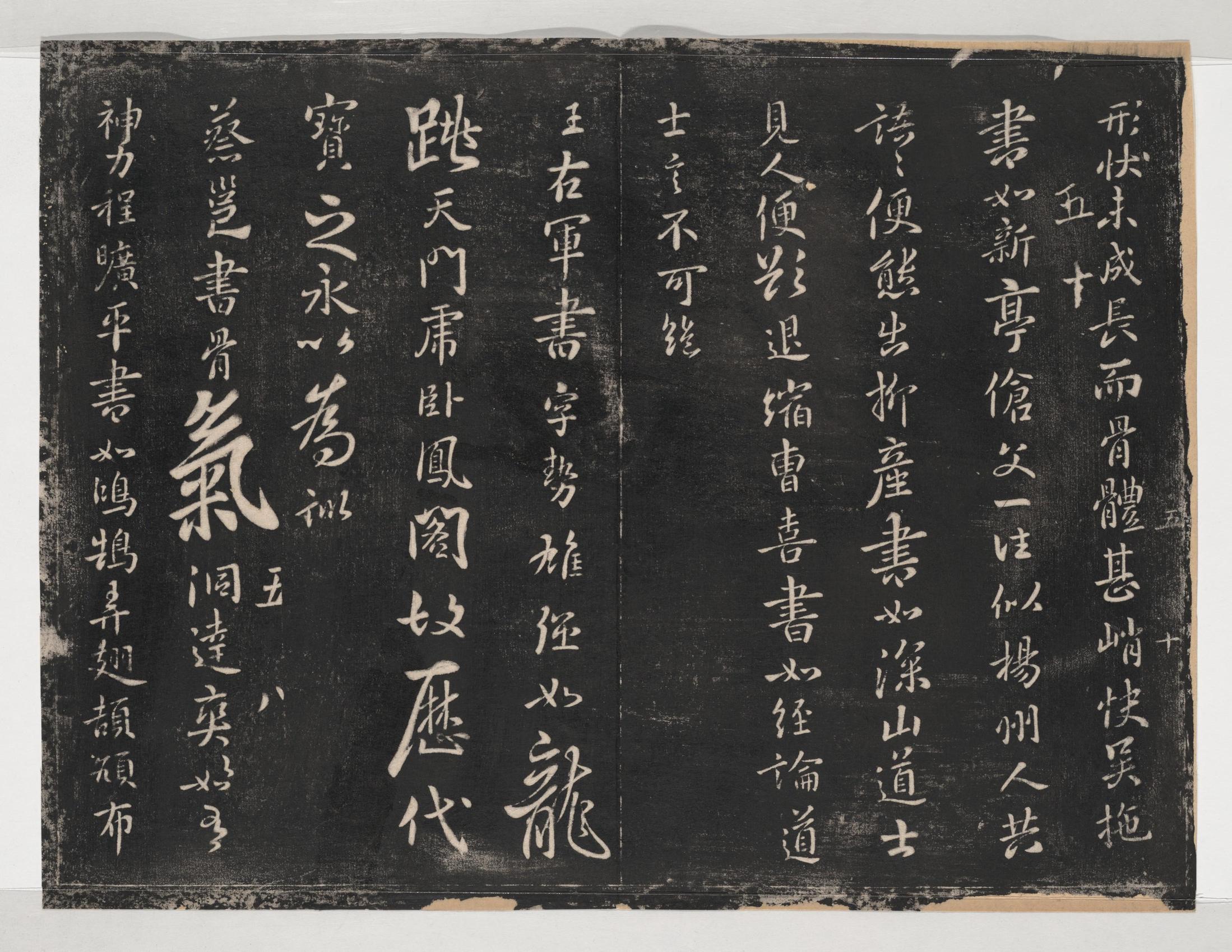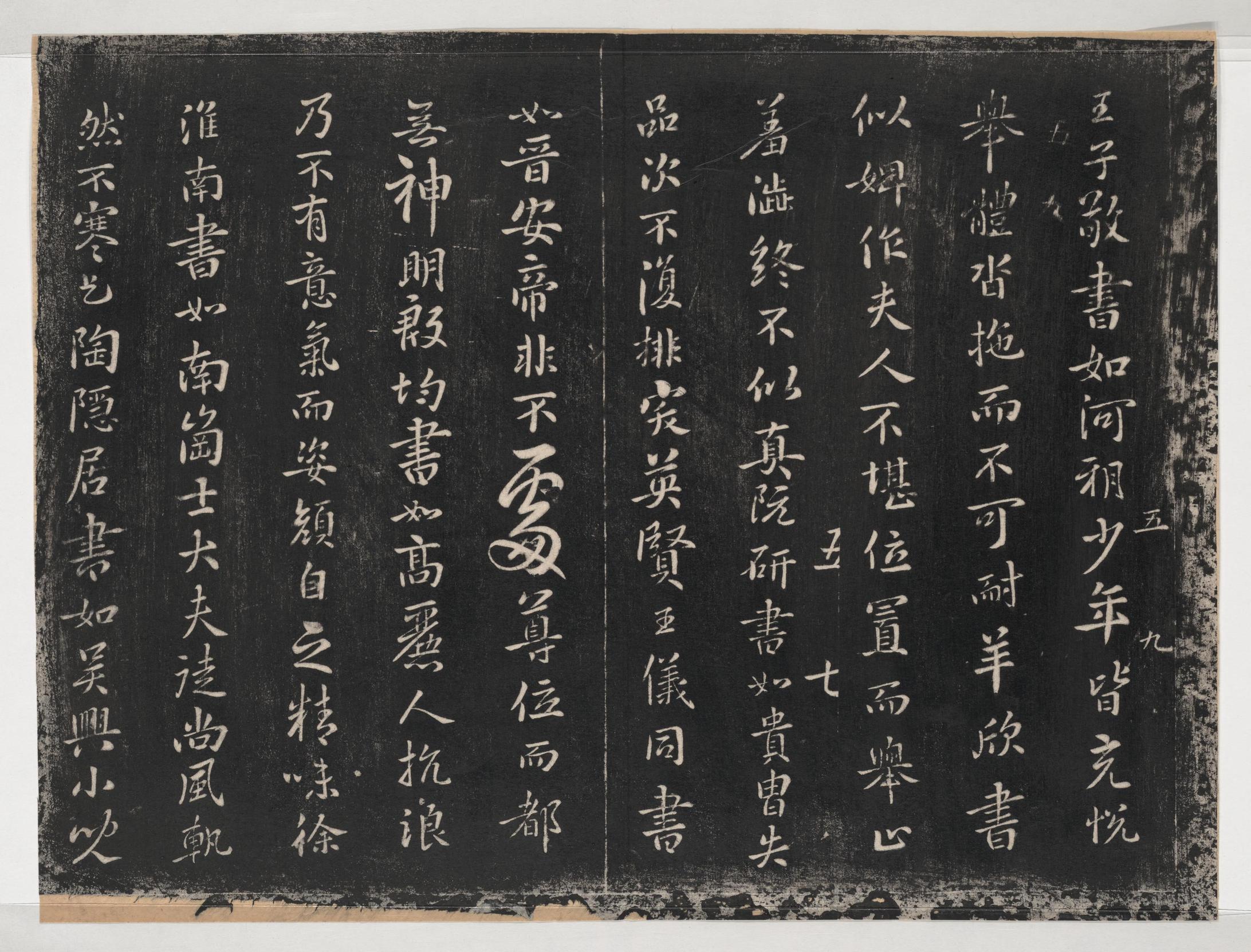王子敬书如河朔少年,皆充悦,举体沓拖而不可耐;羊欣书似婢作夫人,不堪位置,而举止羞涩,终不似真;阮研书如贵胄失品次,不复排突英贤;王仪同书如晋安帝,非不处尊位而都无神明;殷均书如高丽人,抗浪乃不有意气,而姿颜自足精味;徐淮南书如南岗士大夫,徒尚风轨,然不寒乞;陶隐居书如吴兴小儿