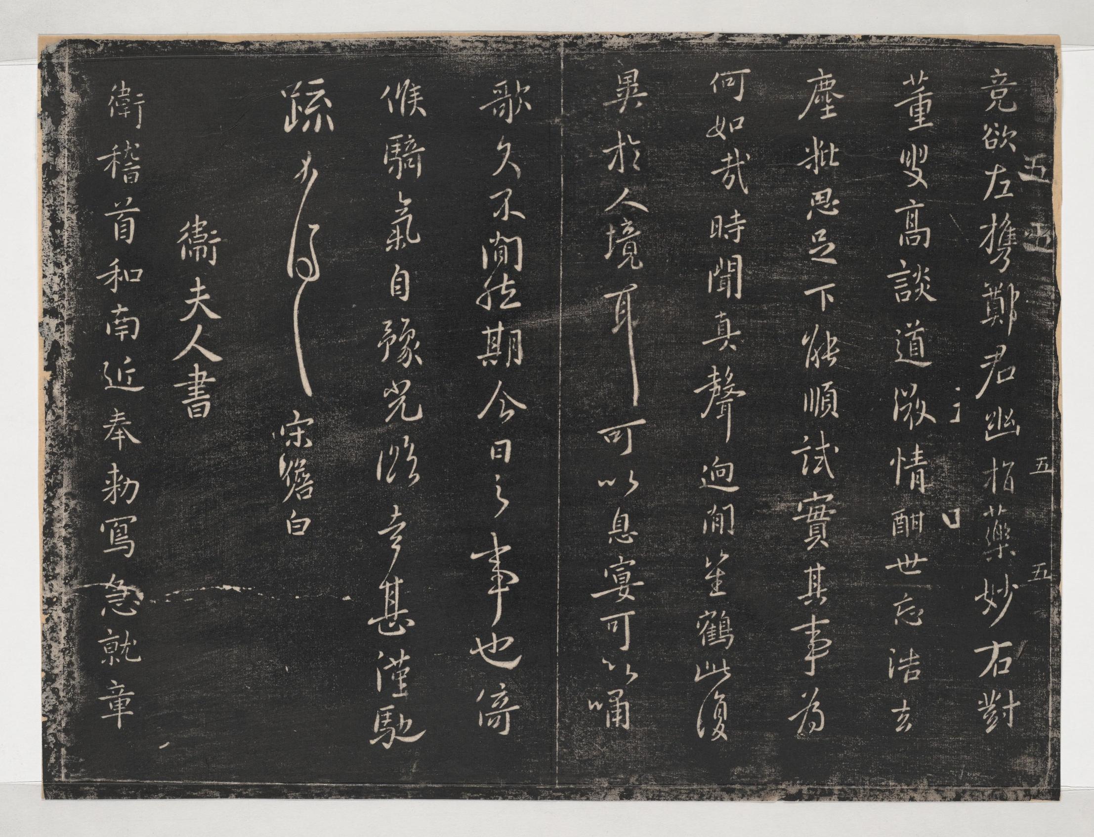 竞(竟)欲左携郑君,幽指药妙;右对董叟,高谈道微。情酣世忘,浩去尘秕(粃同秕),思足下能顺试实其事为何如哉?时闻真声,迥闲笙鹤,此复异于人境耳。可以息宴,可以啸歌,久不间然,期今日之事也。倚候(侯)骑气自豫光临幸甚。谨驰疏不得(具)。宋儋白。卫夫人书。卫稽首和南。近奉敕写急就章,