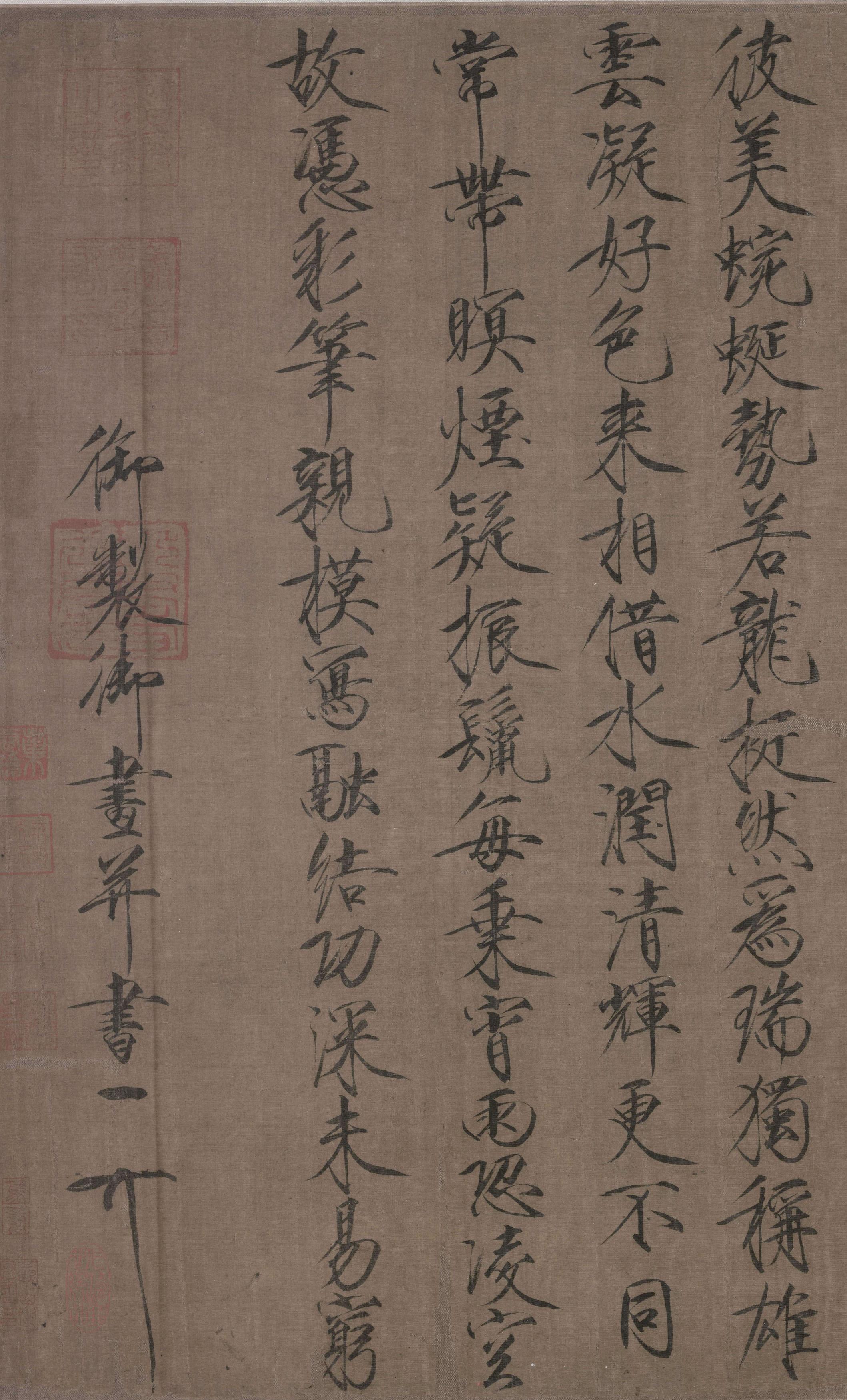 彼美蜿蜒勢若龍,挺然爲瑞獨稱雄。雲凝好色来相借,水潤清輝更不同。常帶瞑煙疑振?,毎乗宵雨恐凌空?故憑彩筆親模冩,融结功深未易窮。御製御畫并書。一。