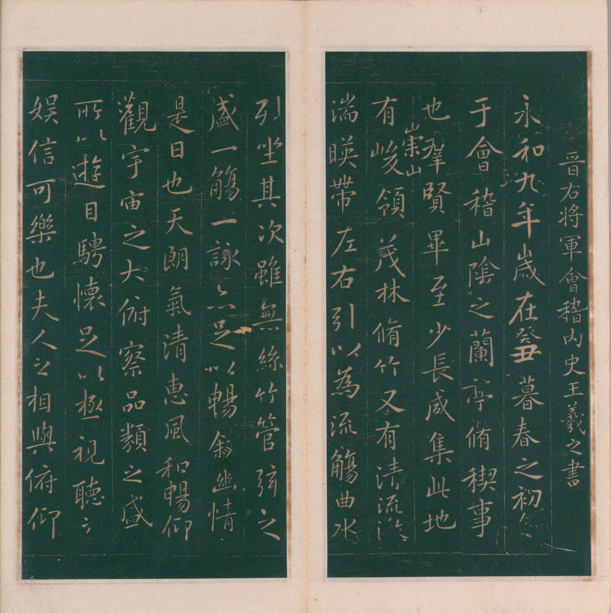 诞,齐彭殇为妄作。后之视今,亦由今之视昔,悲夫!故列叙时人,录其所述,虽异,所以兴怀,其致一也。后之揽者,亦将有感于斯文。右军摛华,夐绝今古。遗踪展玩。龙蟠凤翥。藏诸巾袭。冠耀书府。