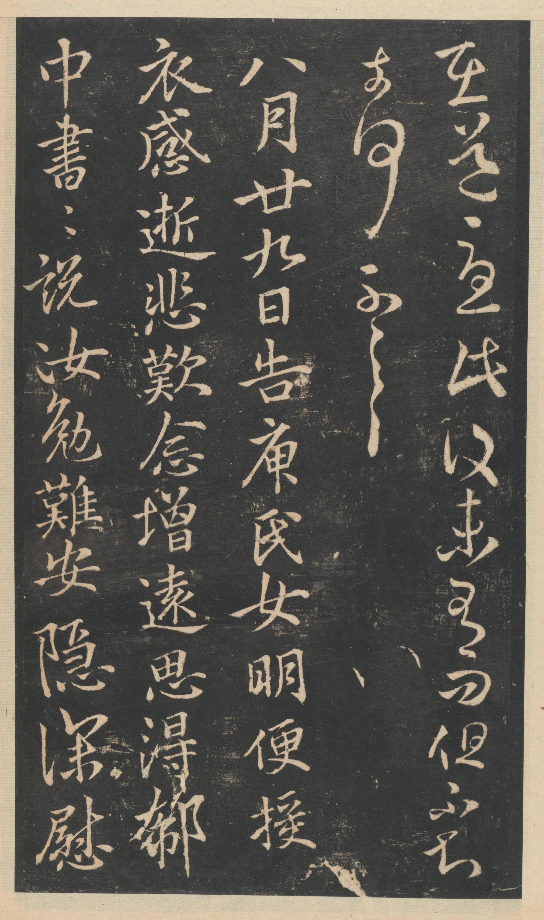 在道忧民复未有问但不知,奈何,不(一一)。 八月廿九日告庾氏女,明便授衣,感逝悲叹,念增远思,得郗中书书。说汝勉难,安隐深慰