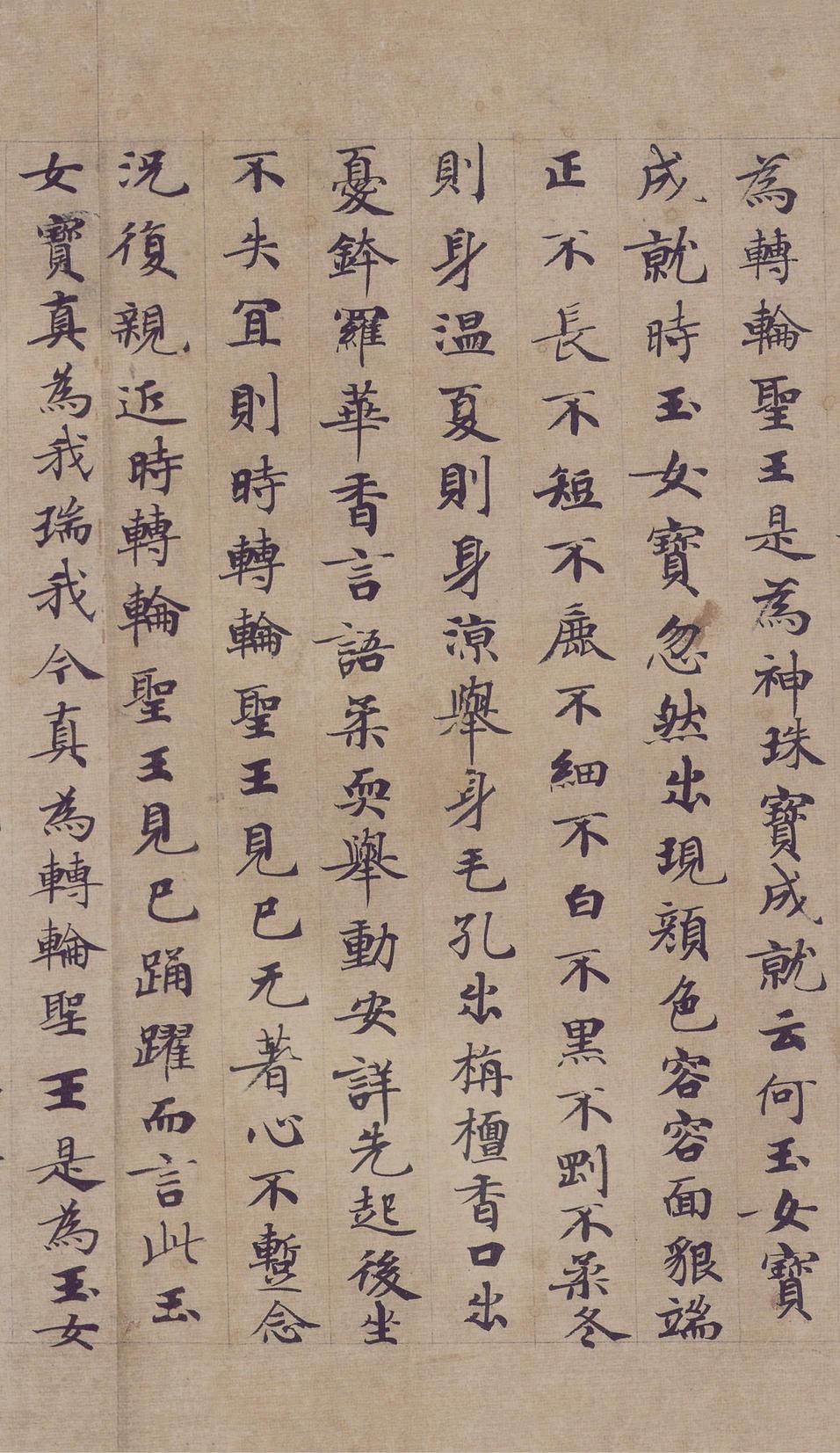 為轉輪聖王。是為神珠寳成就。云何玉女寳成就。時。玉女寳忽然出現。顔色容容。面貇端正。不長不短。不麁不細。不白不黒。不㓻不柔。冬則身温。夏則身涼。舉身毛孔出栴檀香。口出憂鉢羅華香。言語柔耎。舉動安詳。先起後坐。不失冝則。時。轉輪聖王見巳无著。心不蹔念。況復親近。時。轉輪聖王見巳。踊躍而言。此玉女寳真為我瑞。我今真為轉輪聖王。是為玉女
