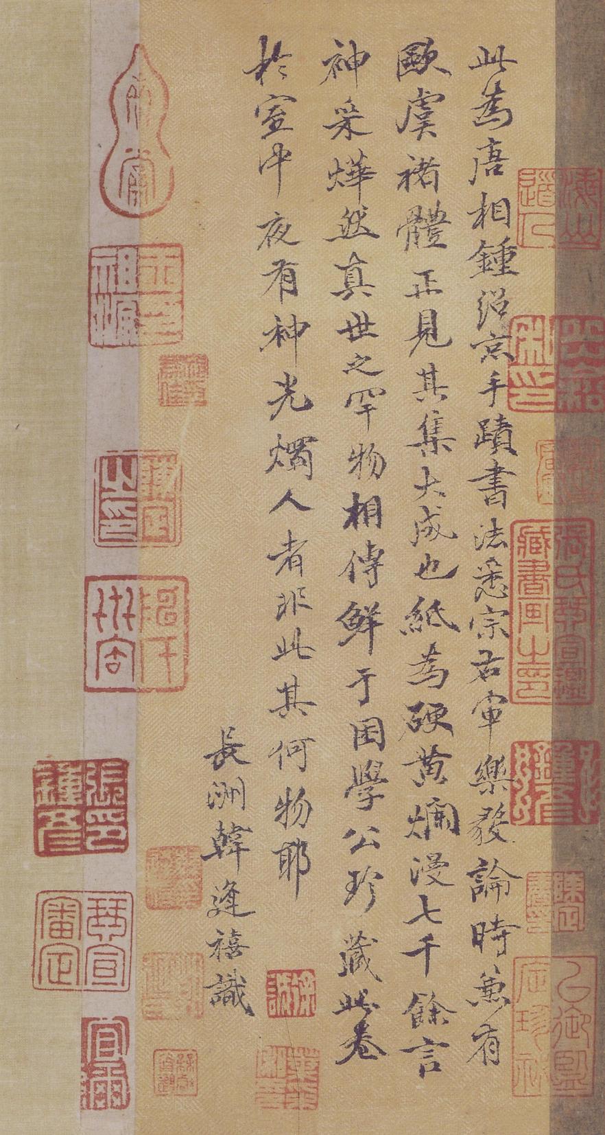此為唐相鍾绍京手蹟,書法悉宗右軍樂?論時,?有歐、虞、褚體。正見其集大成也。紙為硬黄,爛漫七千餘言,神采燁然,真世之罕物。相傳鲜于困學公珍蔵此卷。扵室中夜有神光燭人者,非此其何物耶。長洲韓逢禧識。