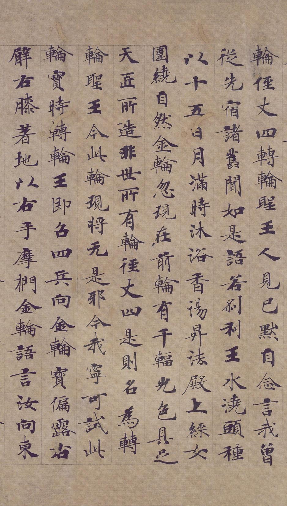 書?度東西十二由旬。南北十由旬。天神扵中夜造城郭。其城七重。七重欄楯、七重羅䋄、七重行樹。周帀交飾。七寳所成。乃至无數衆鳥相和而鳴。造此城已。金輪寳復扵其城中。?度封地東西四由旬。南北二由旬。天神扵中夜造宫殿。宫牆七重。七寳所成。乃至无數衆鳥相和而鳴。亦復如是。造宫殿巳。時金轉寳在宫殿上虚空中住。完具而不動轉。轉輪