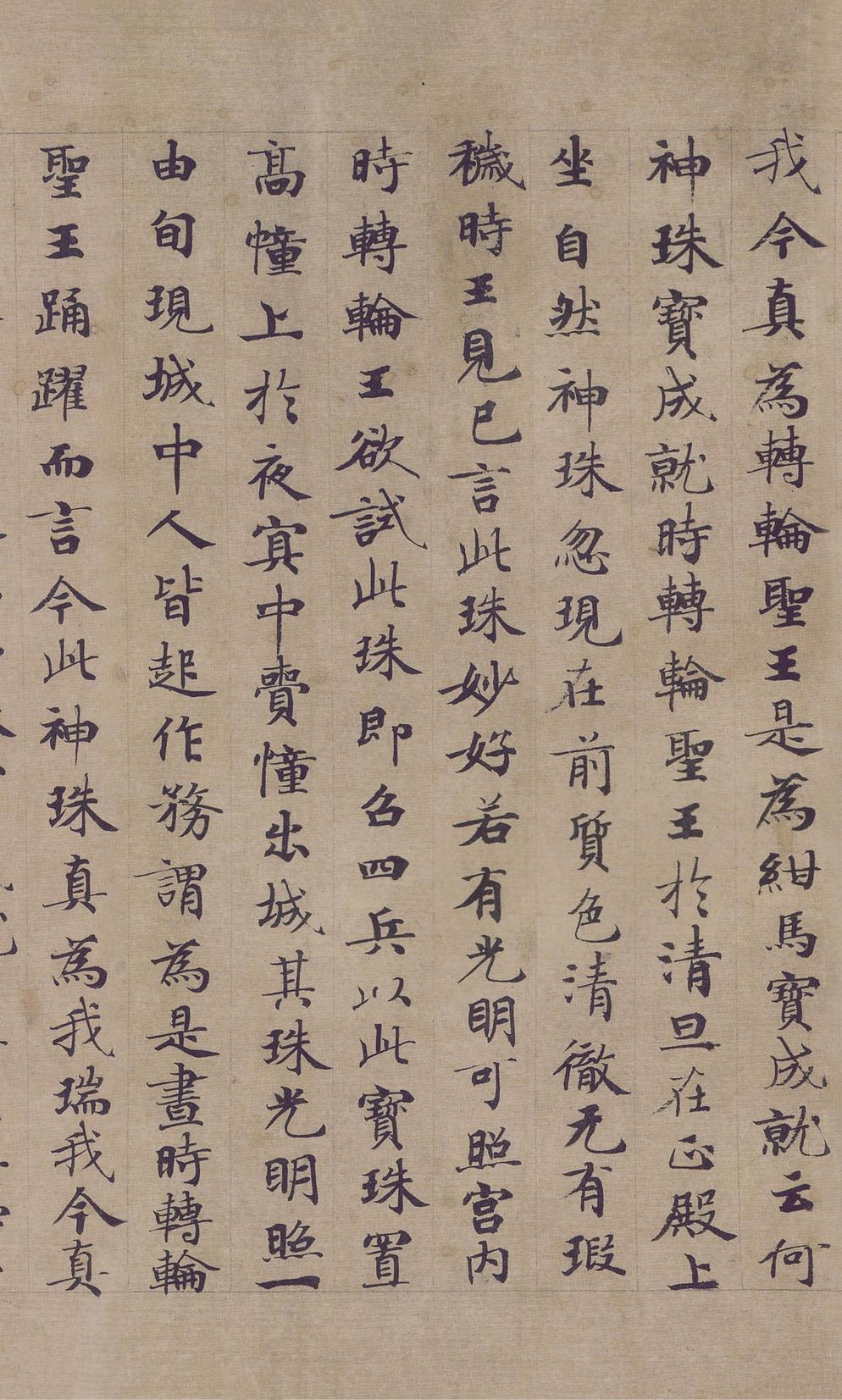 我今真為轉輪聖王。是為紺馬寳成就。云何神珠寳成就。時。轉輪聖王扵清旦在正殿上坐。自然神珠忽現在前。質色清徹。无有瑕穢。時。王見巳言。此珠妙好。?有光眀。可照宫内。時。轉輪王欲試此珠。即召四兵。以此寳珠置髙幢上。扵夜?中。賷憧(幢)出城。其珠光眀照一由旬。現城中人皆起作務。謂為是晝時。轉輪聖王踊躍而言。今此神珠真為我瑞。我今真