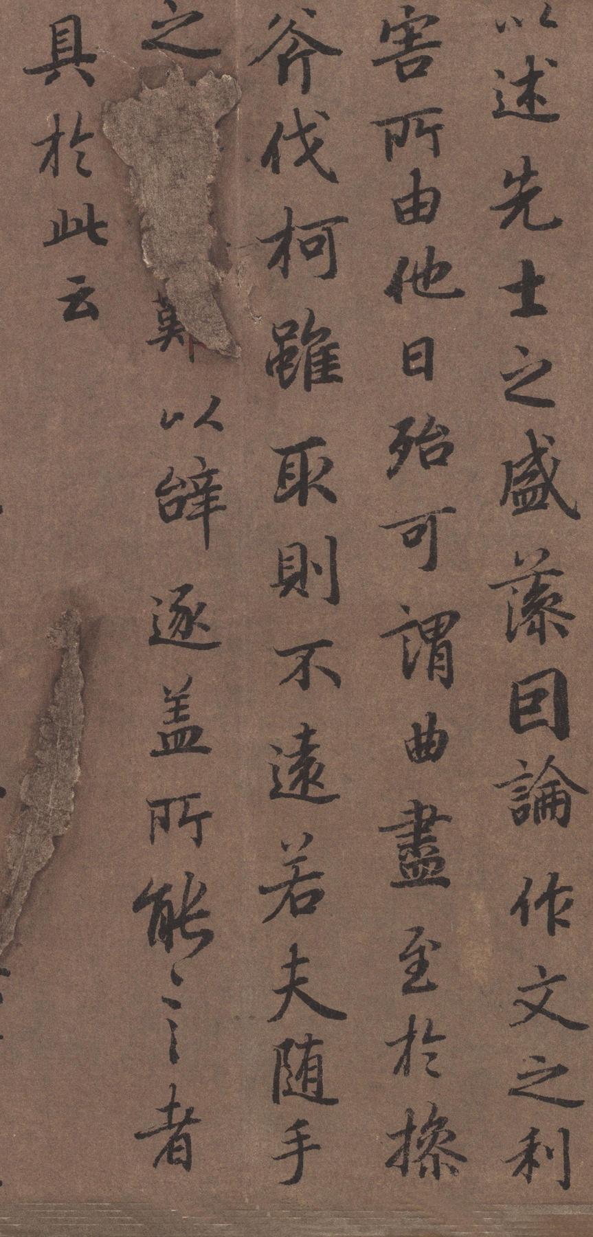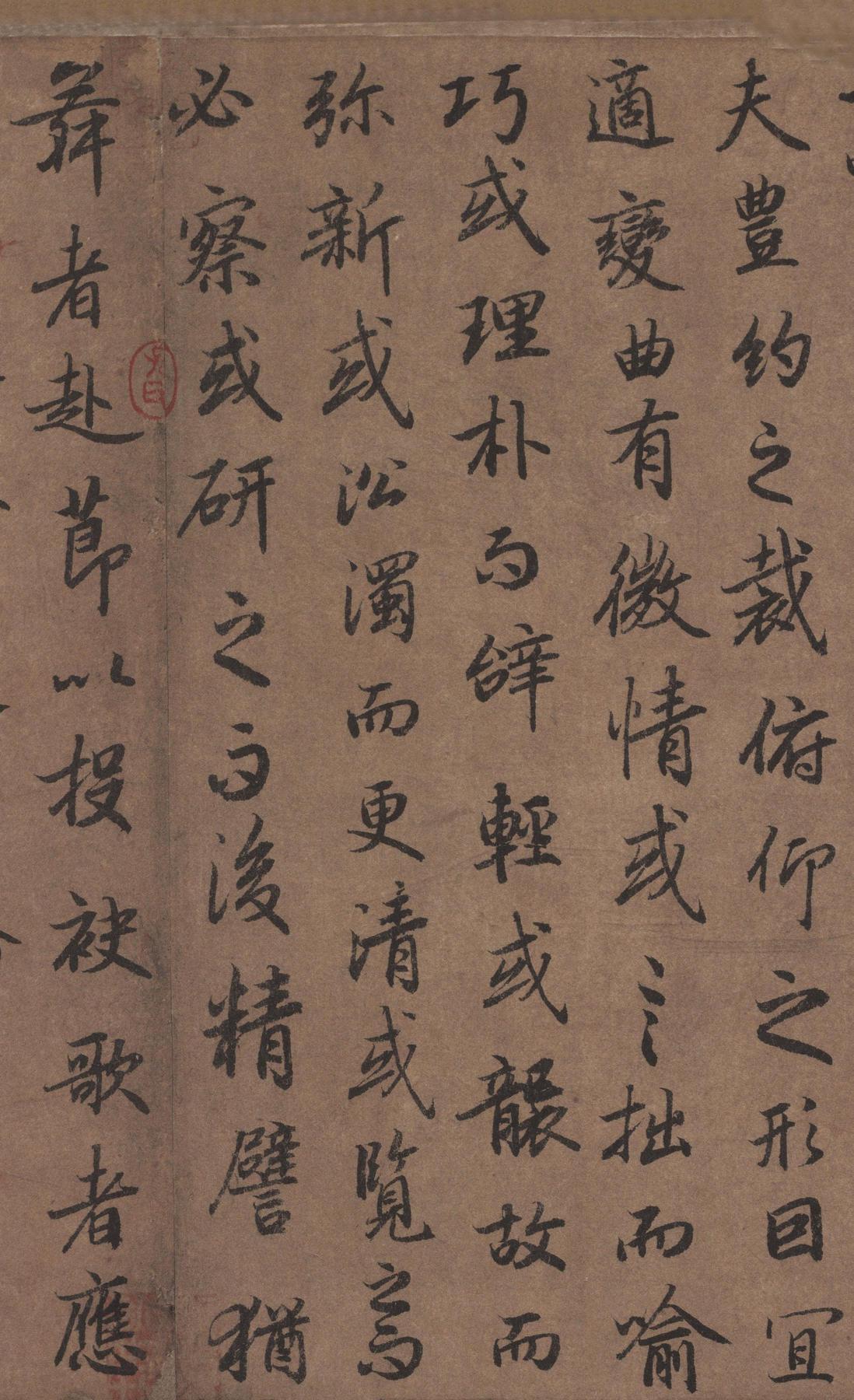 欧阳公作李晸笔说云,唐所谓欧虞褚陆至于颜柳皆自名家,以陆书少传于世,及或以欧虞褚薛为疑。又附柬之书学品第之详,其予之亦深矣。今观所书陆机《文赋》,真有晋人风格。较之兰亭临本果孰右耶。子昂李士弘皆号善书者,鉴定之余称许不已。余于是益知柬之书法之妙,但宝之勿失存乎,其人为吾后者慎诸。京口曹仿识。