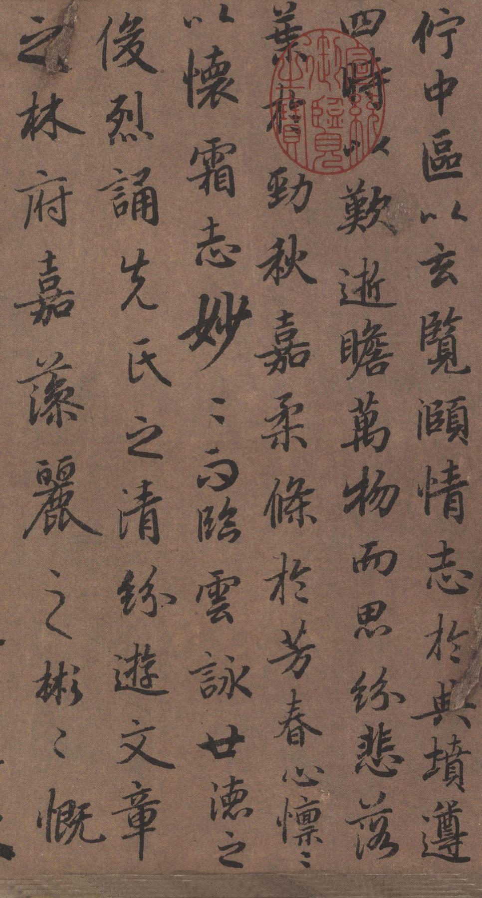 陆司谏所书《文赋》全摹禊帖,而带有其舅氏虞永兴之员劲,遂觉韵法双绝。唐初诸公仿晋率涉板直,如此妙腕未见其匹。赵文敏晚年书法全从此得力,人鲜见司谏书,遂不知文敏所自来耳。北平孙承泽记。