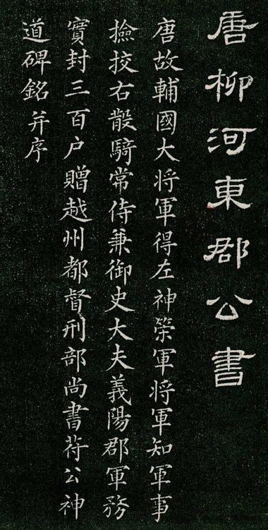 《唐柳河东郡公书》唐故辅国大将军得左神策军将军知军事检校右散骑常侍兼御史大夫义阳郡军务实封二百户赠越州都督刑部尚书苻公神道碑铭并序。