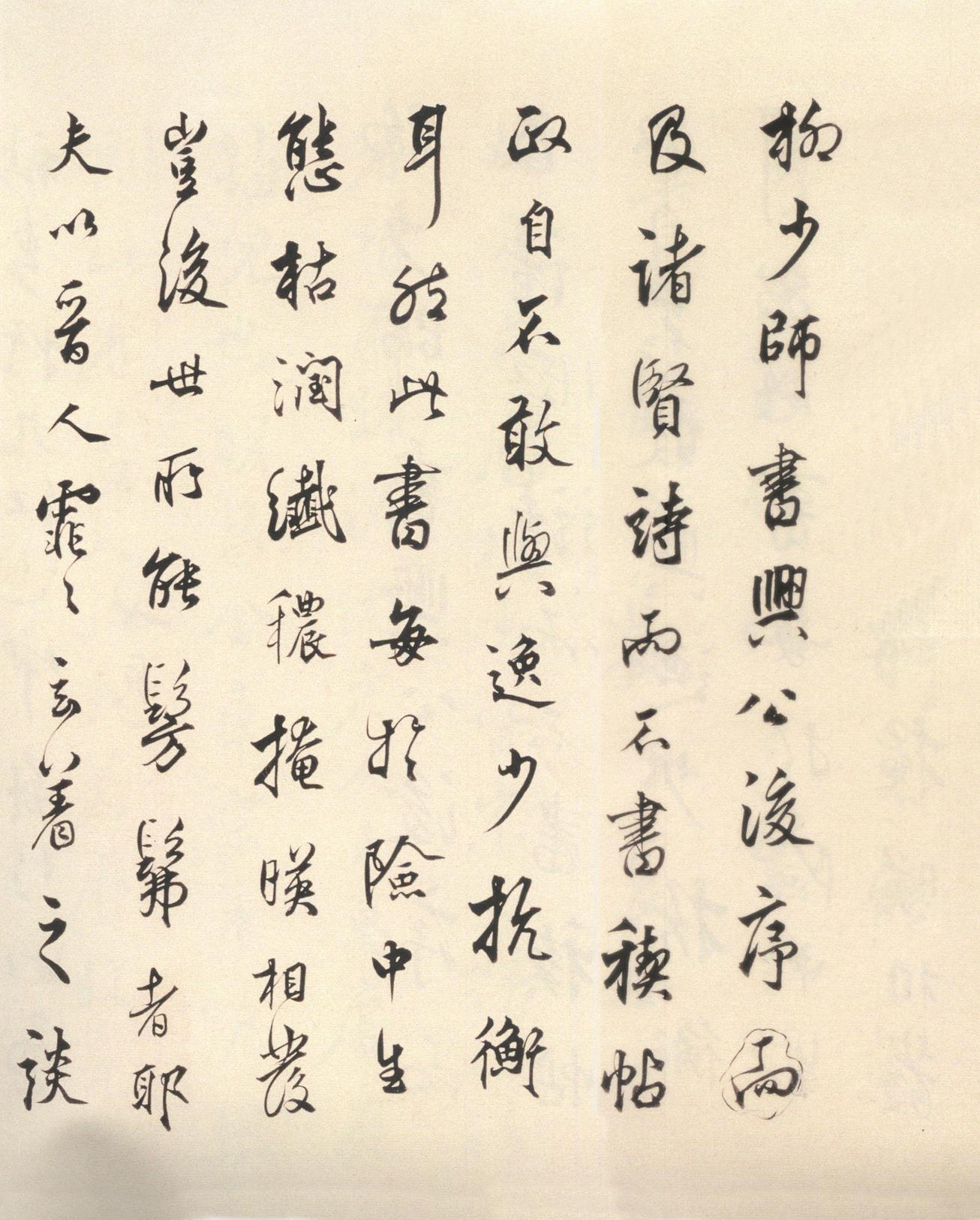 公此书乍看之,亦似有一二俗笔,而久之则俗者入眼作妩矣。殆似髭圣之视羊鼻翁也。锋劲处真纯钩铎矟,游丝细笔亦似铁铸,中间一、二