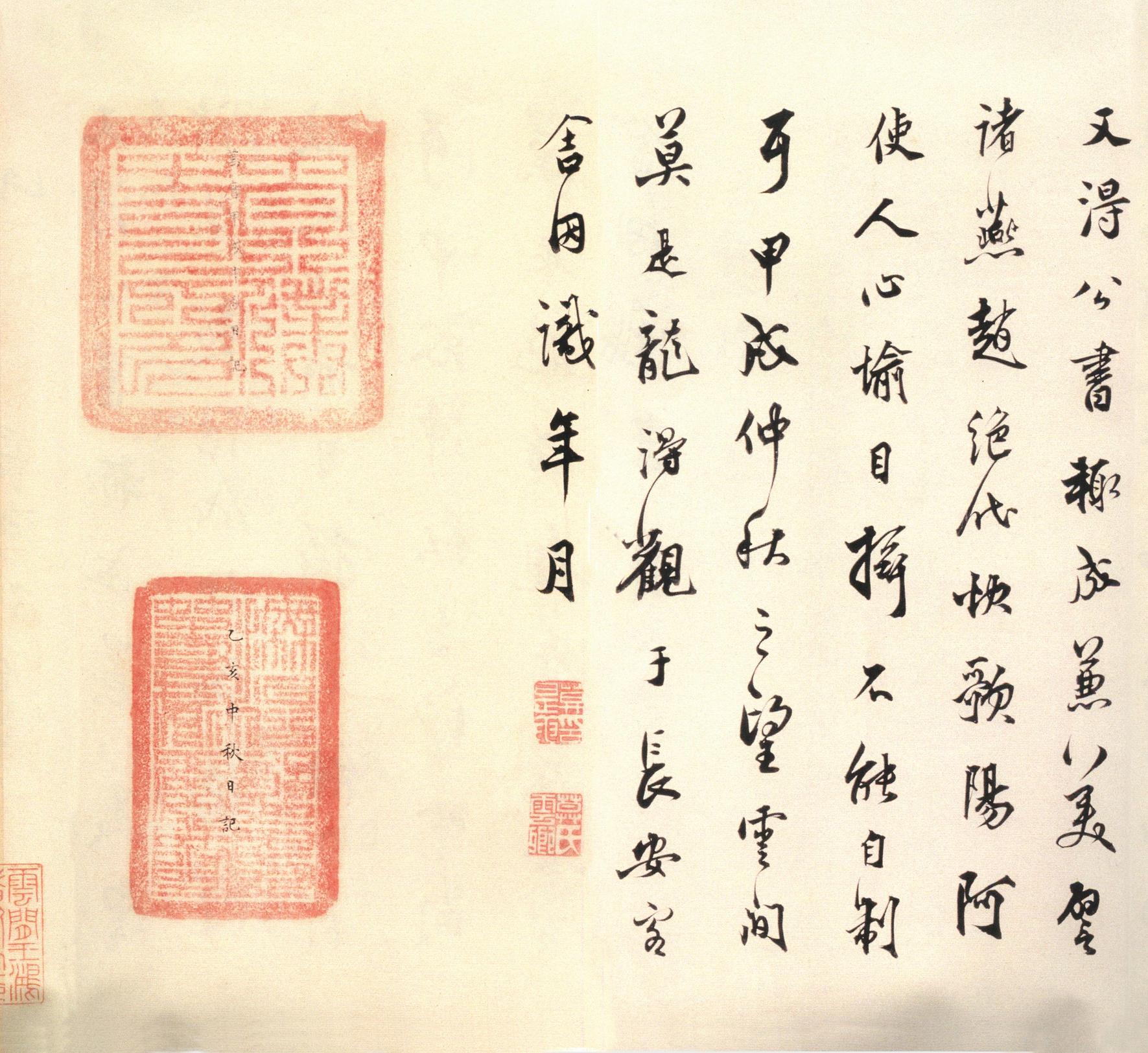 又得公书,辄成兼美。譬诸燕赵绝代快歌阳阿,使人心愉,目摄不能自制耳。甲戌仲秋之望,云间莫是龙得观于长安客舍,因识。年月。