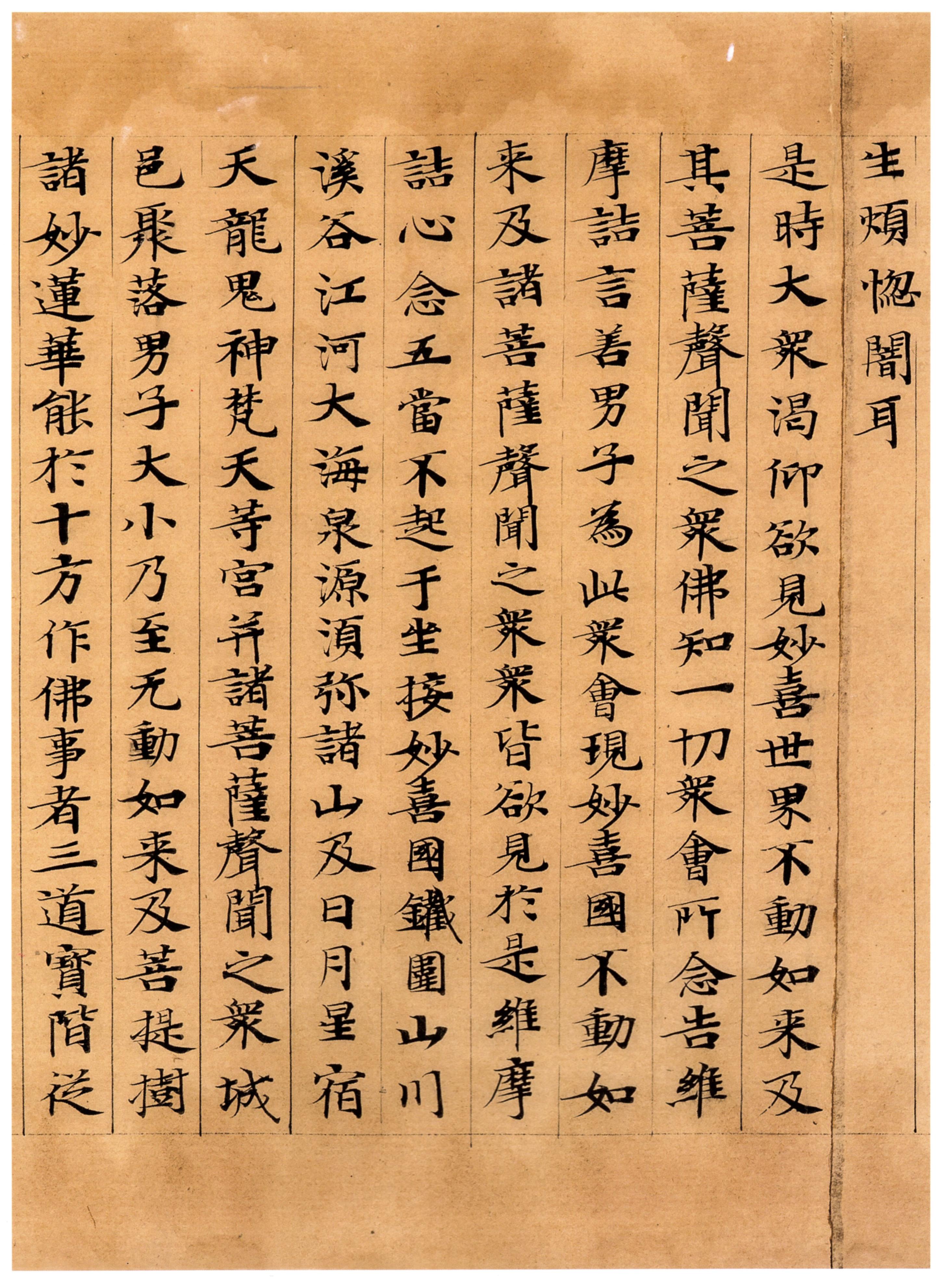 是時大衆渴仰,欲見妙喜世界不動如来及其菩薩聲聞之衆。佛知一切衆㑹所念,告維摩詰言:善男子,為此衆㑹,現妙喜國不動如来及諸菩薩聲聞之衆,衆皆欲見。扵是維摩詰心念:五當不起于坐,接妙喜國,鐵圍、山川溪谷、江河大海、泉源、须弥諸山,及日月、星宿、天龍、鬼神、梵天䓁宫,并諸菩薩聲聞之衆,城邑、聚落,男子、大小,乃至无動如来,及菩提樹、諸妙蓮華,能扵十方作佛事者。三道寳階,従