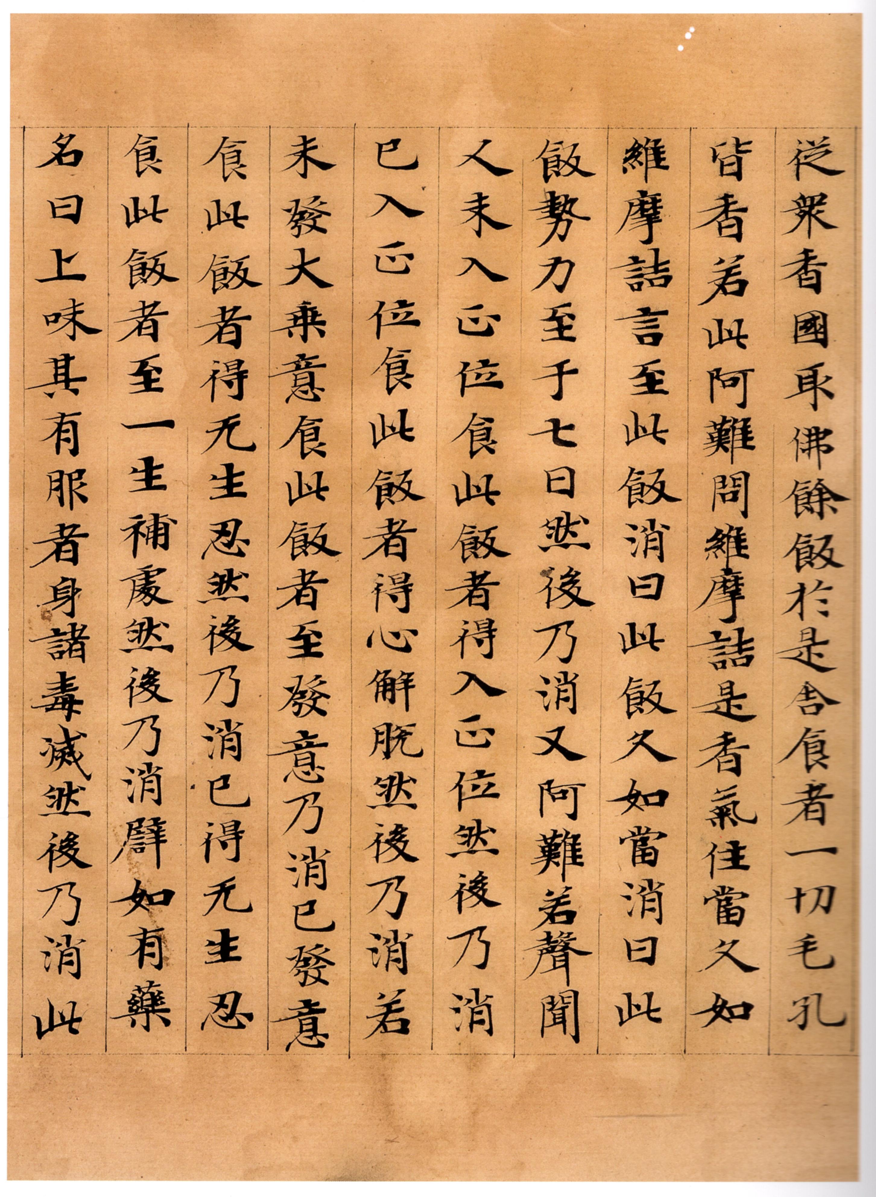 従衆香國,取佛餘飯,扵是舎食者,一切毛孔皆香若此。”阿難問維摩詰:“是香氣住當久如?”維摩詰言:“至此飯消。”曰:“此飯久如當消?”曰:“此飯勢力至于七日,然後乃消。又阿難,若聲聞人,未入正位,食此飯者,得入正位,然後乃消;巳入正位,食此飯者,得心解脱,然後乃消;若未發大乗意,食此飯者,至發意乃消;巳發意食此飯者,得无生忍,然後乃消;巳得无生忍,食此飯者,至一生補䖏,然後乃消。譬如有藥,名曰上味,其有服者,身諸毒㓕,然後乃消。此