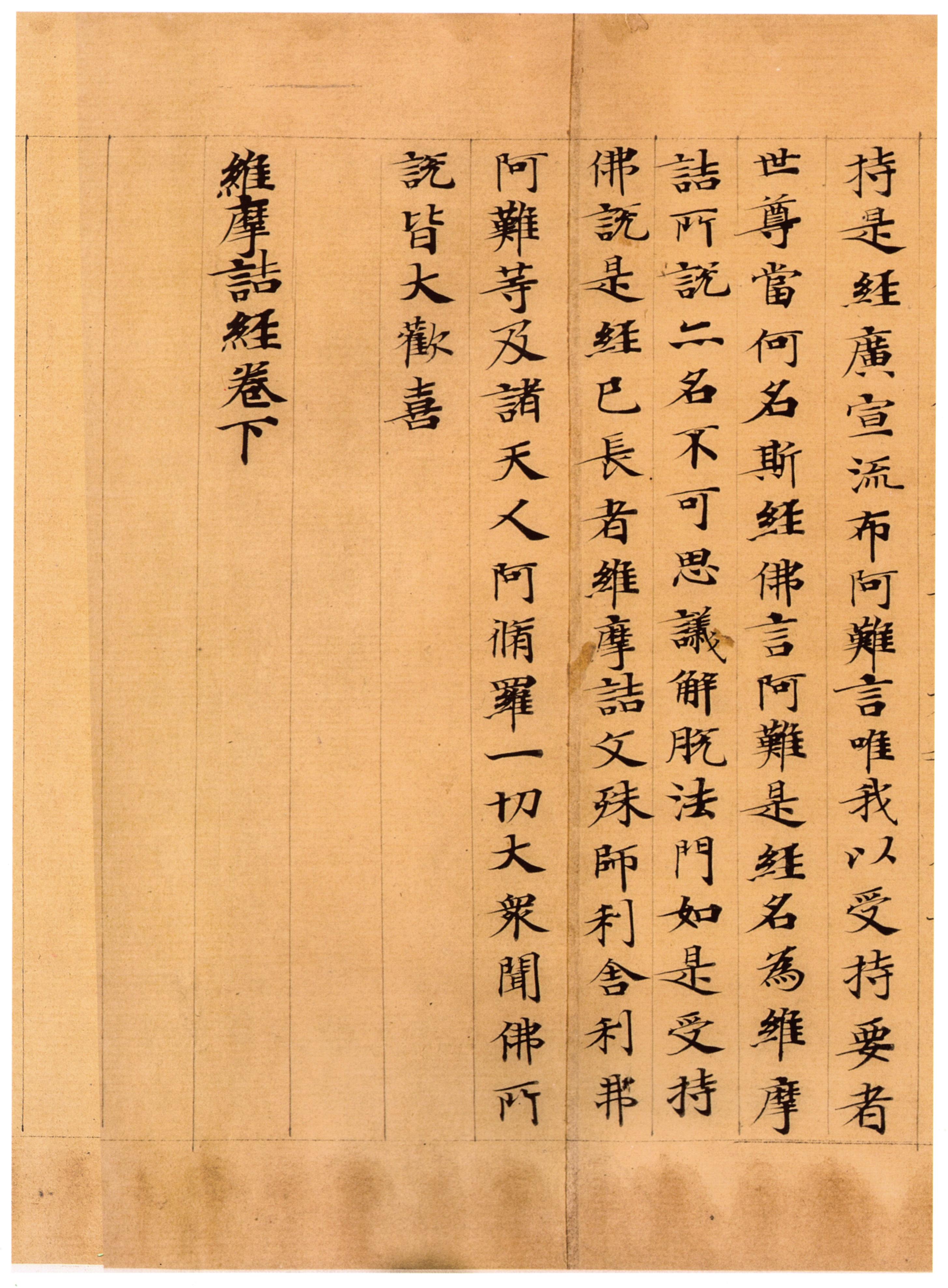 世尊,當何名斯經?佛言:阿難,是經名為維摩詰所說,亦名不可思議解脫法門,如是受持。佛說是經巳,長者維摩詰、文殊師利、舎利弗、阿難䓁,及諸天人、阿脩羅一切大衆,聞佛所說,皆大歡喜。維摩詰經卷下。