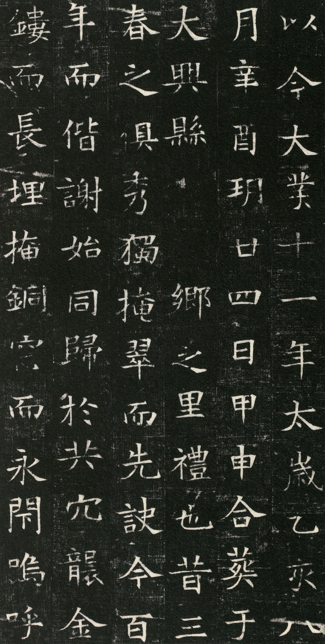以今大業十一年,太嵗,乙?八月,辛酉玥廿四日,甲申合?于大興縣郷之里,禮也,昔三春之俱秀,獨掩翠而先訣,今百年而偕謝,始同歸扵共穴,?金鏤而長埋,掩銅窓而永閇,嗚呼
