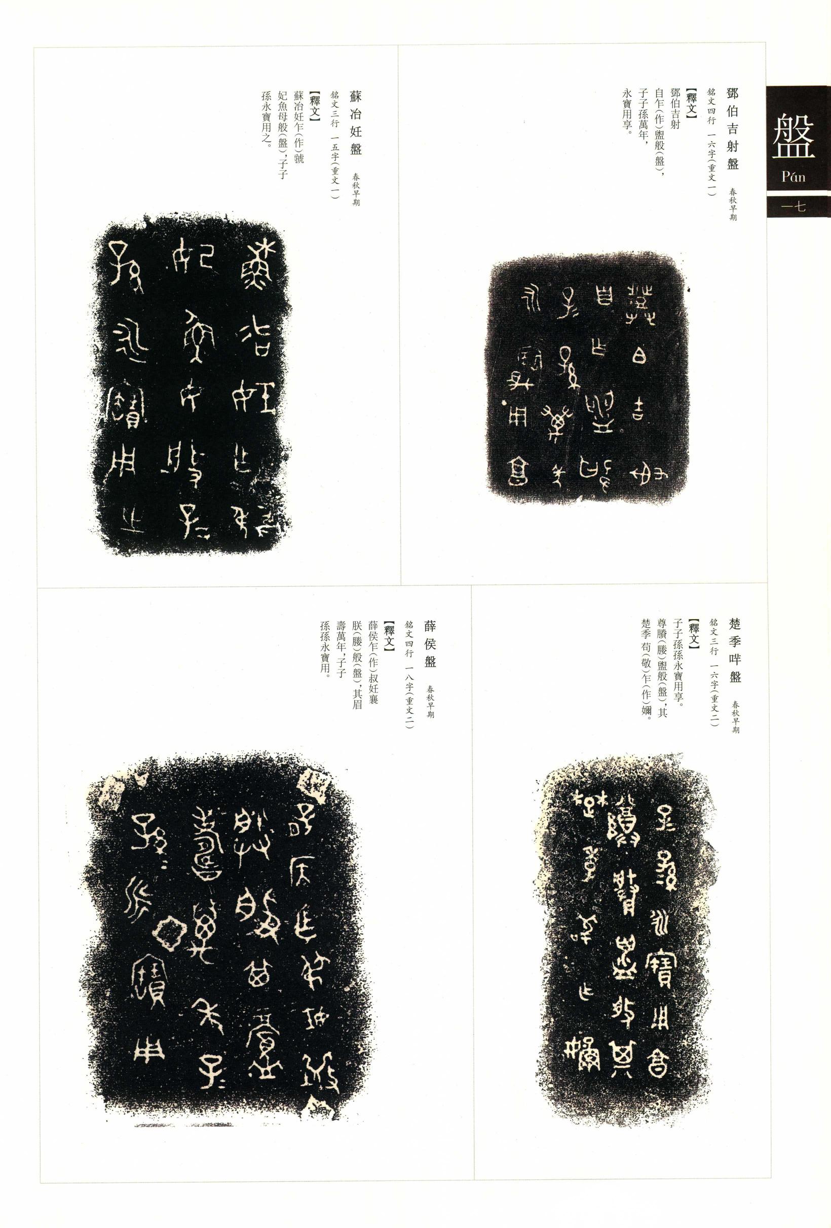 鄧白吉射自乍盥般子子孫孫萬年,永寶用亯;蘇冶妊乍虢妃魚母般,子子孫永寶用之;子子孫孫永寶用亯,尊賸盥般,其䠂季苟乍嬭;薛侯乍尗妊襄朕般,其眉壽萬年,子子孫孫永寶用。