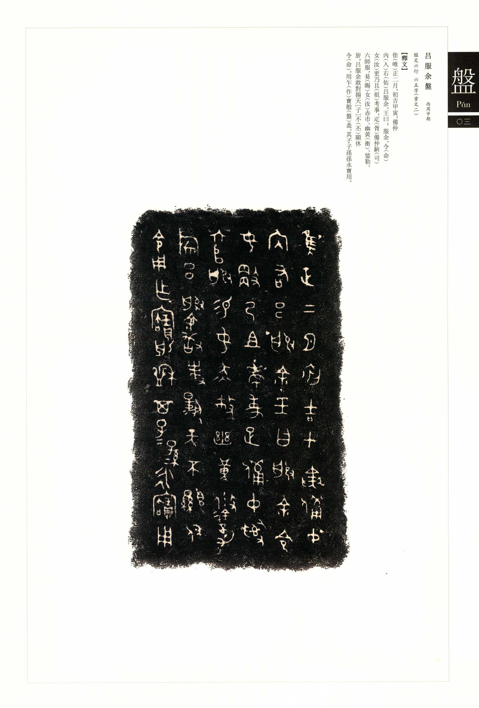 隹正二月,初吉甲寅,備中内右吕服余,王曰:服余,令女更乃且考事,疋備中辭六師服,易女赤巿、幽黄、鋚勒、旂,吕服余敢對揚天不顯休令,用乍寶般盉,其子子孫孫永寶用。